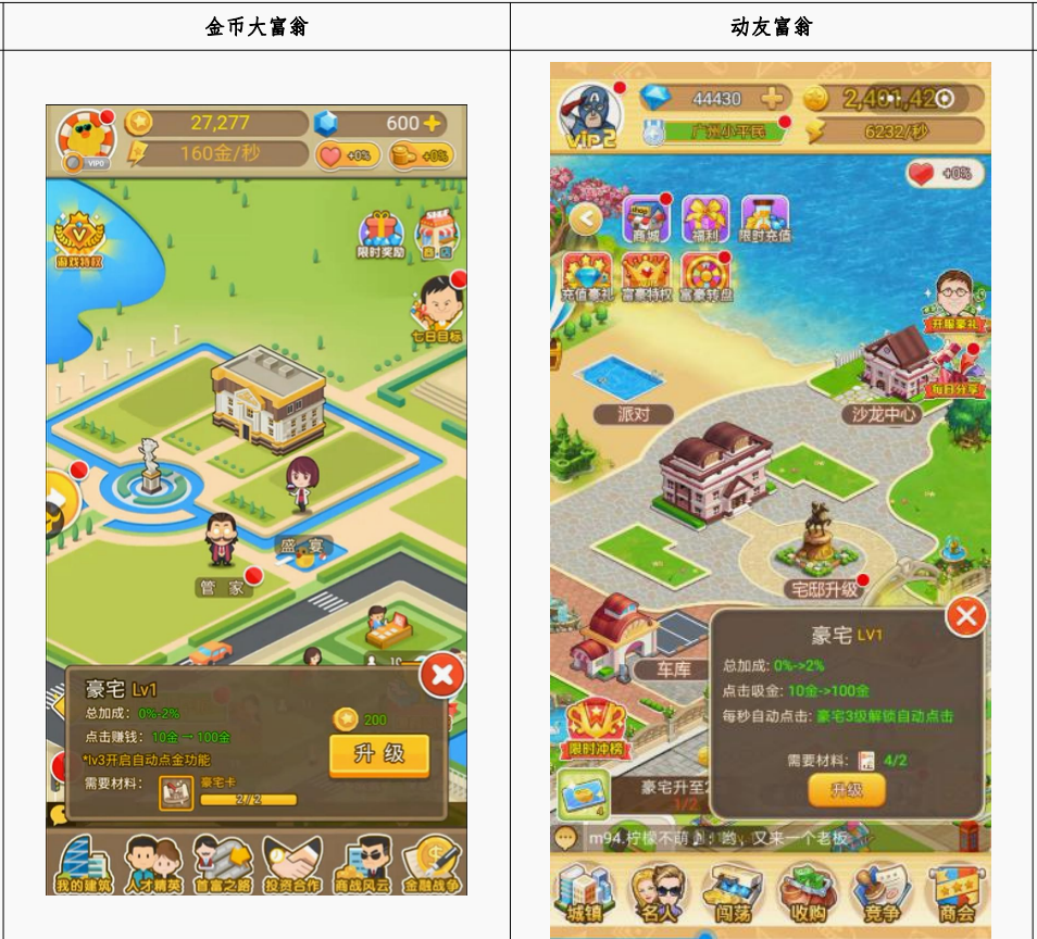 麟贝公司、动友公司、摩多公司共同研发、运营的《动友富翁》游戏,在游戏内容上整体抄袭《金币大富翁》手游的“建筑系统”“人才精英系统”“投资合作系统”“商战系统”“金融战争系统”“座驾系统”“豪宅系统”“成就系统”“每日任务”等游戏设计,甚至出现《动友富翁》游戏中的bug内容与《金币大富翁》雷同的情况。
